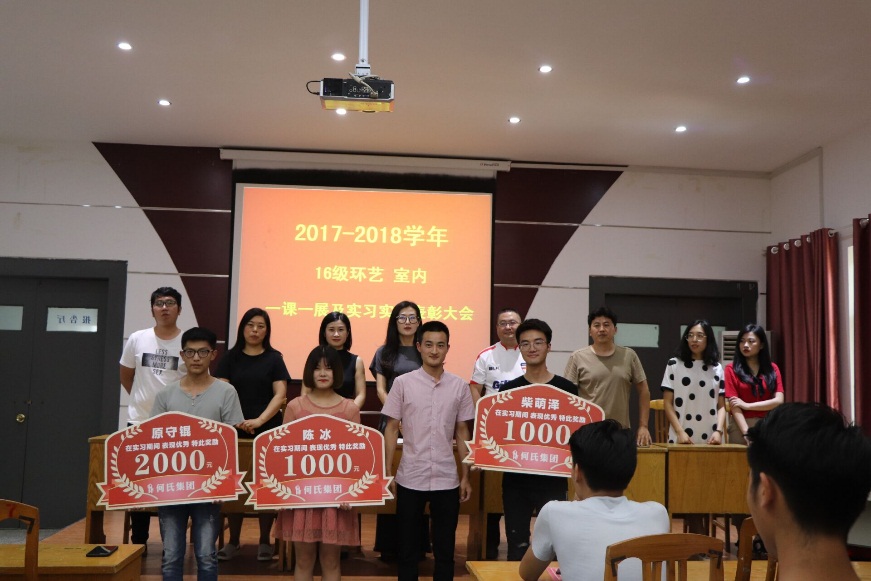 下午,16级环境艺术设计、室内艺术设计专业的师生在美术馆报告厅召开了“一课一展”及顶岗实训”表彰大会, 并对“一课一展”优秀作品进行表彰颁奖。评出一等奖4组,二等奖5组,三等奖,8组,并颁发了奖品与证书。漯河何氏集团的总经理助理张文豪也出席了会议。