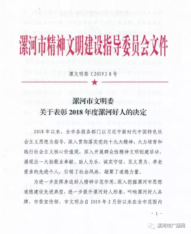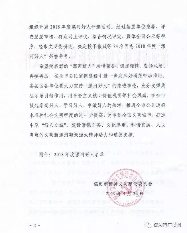 近日,漯河市文明委下发文件,经市文明委研究,决定授予张斌等74名同志2018年度“漯河好人”荣誉称号。 公司教师陈明杰作为“敬业奉献”代表,和他的员工张斌作为“诚实守信”代表同时获此殊荣。