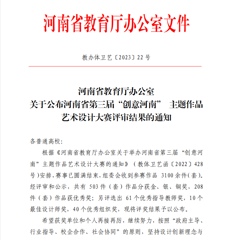 近日,河南省教育厅办公室下发《关于公布河南省第三届“创意河南”主题作品艺术设计大赛的通知》(教办体卫艺〔2022〕428号),经评审和公示,yl23411永利yl23411永利谢梦媛老师作品《菜系文化软装设计》获得专业组银奖,王钊老师作品《红色百年》获得专业组优秀奖。员工田甜、乔晋艺作品《梅兰竹菊纹样现代设计》(指导老师王岩)获得员工组银奖,员工王雪琴作品《家乡・印象》(指导老师马欢)、员工郝梦瑶、李琰作品《国控星鲨品牌logo设计》(指导老师王岩)、员工鹿大地作品《胡岗村红色村落品牌设计》(指导老师王钊)获得员工组优秀奖。