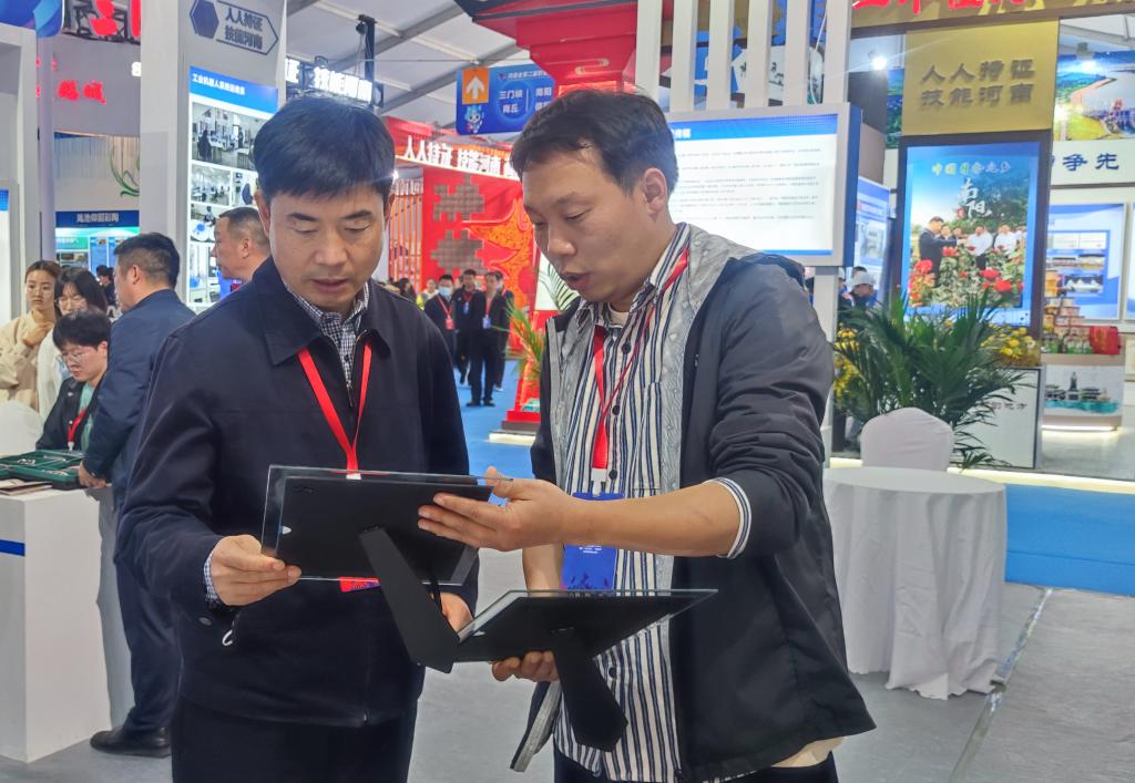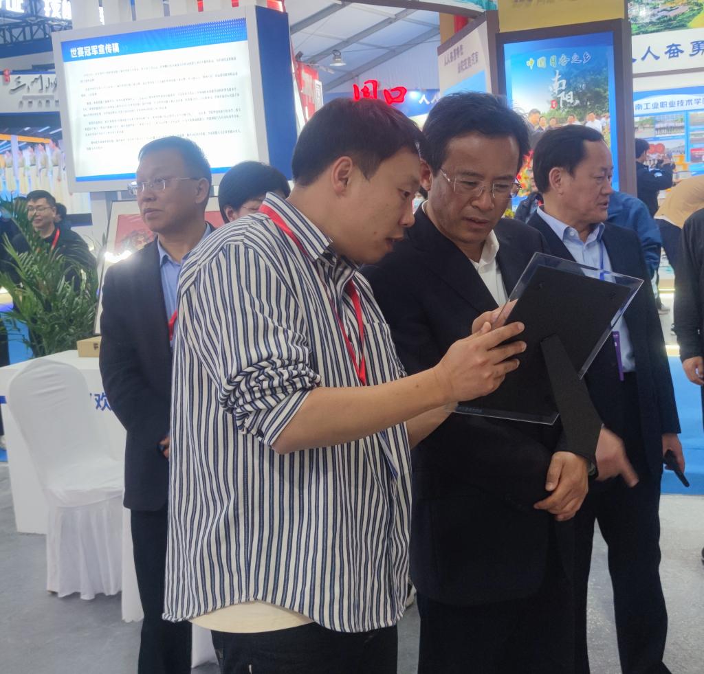 4月26日下午,河南省人力资源和社会保障厅党组书记、厅长丁同民、漯河市人力资源和社会保障局局长宋耀生莅临陈明杰现代剪纸参演展位,丁同民详细了解多层套色剪纸的技艺和创新,认真查看了陈明杰的作品,他表示这种类型的剪纸没有见过,很新颖,很奇特,新工艺的创新非常有利于传统文化的传承与发展。宋耀生对陈明杰作品给予了高度赞扬,也勉励其要继续努力,做好非物质文化遗产的传承与发展,培养更多技能型人才。