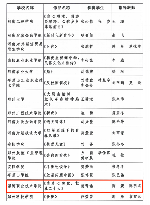 近日,中共河南省委宣传部、共青团河南省委、河南省教育厅、河南省文化和旅游厅、河南省科学技术厅、河南省员工联合会联合下发了《关于发布河南省第十九届老员工科技文化艺术节系列竞赛结果的通知》,yl23411永利成绩显著,员工范豫鑫作品《青春心向党,献礼二十大》获得漫画类二等奖,员工王璐作品《青春筑华章,致敬二十大》、员工王稼迅作品《二十大,新力量》获得漫画类三等奖。