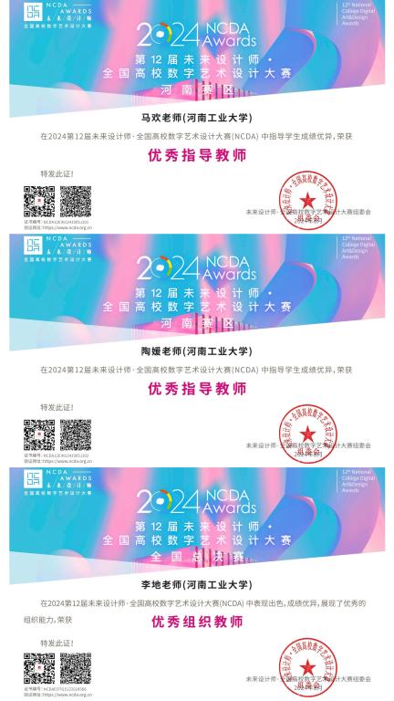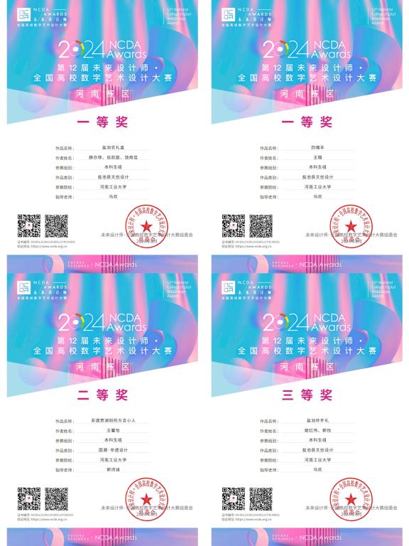 近日,第12届未来设计师全国高校数字艺术设计大赛圆满落幕,公司yl23411永利师生在此次大赛中表现优异,多件作品荣获省级荣誉。马欢老师指导的员工参赛作品《盐池县文创设计》(作者:薛亦菲、岳凯旋、饶雨佳),荣获省级一等奖;《盐池县文创设计》(作者:王璐),荣获省级一等奖;《盐池伴手礼》(作者:姬红伟、郭怡)荣获省级三等奖;郭诗涵老师指导员工参赛作品《非遗贾湖刻符方言小人》(作者:王馨怡)荣获省级三等奖;陶媛老师、马欢老师荣获优秀指导教师;李地老师荣获优秀组织教师。