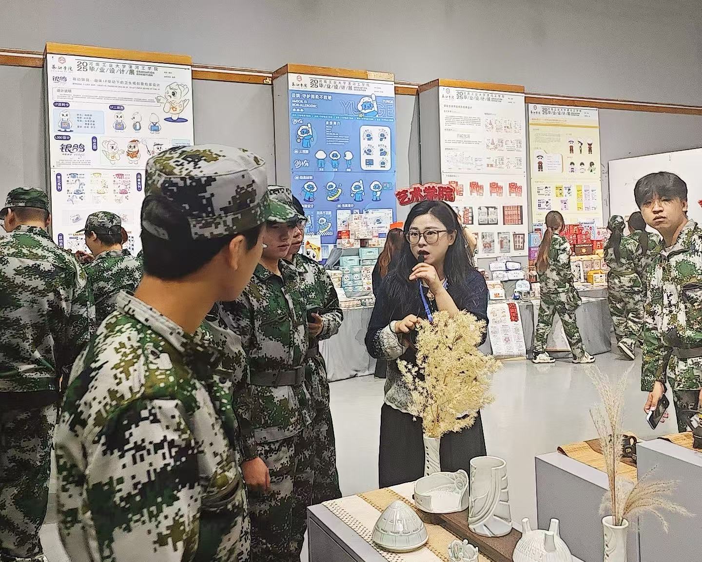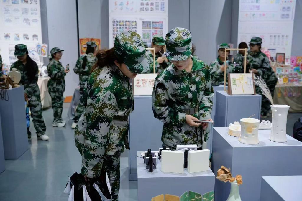 美术馆内三个展厅依次为新生们展开了不同维度的艺术画卷。在一号“文化点亮城市,设计赋能产业” 文创作品展展厅,一件件将漯河地域文化与现代设计理念深度融合的文创作品吸引了新生们的目光。从特色生活用品到产业升级设计,传递 “设计服务生活、赋能产业” 理念;陈思老师结合展品讲解文化价值挖掘与商业转化,引导新生思考设计现实意义。二号展厅陈列着众多具有较高艺术价值与历史意义的经典作品,涵盖了不同艺术流派、不同创作年代的佳作。三号展厅展示公司往届员工优秀作品,涵盖艺术设计多方向,兼具专业功底与创新思维。大家不时驻足观看,认真聆听讲解,有的还拿出手机记录下精彩瞬间,并不时与身边同学交流自己的观展感悟,现场学习氛围浓厚。