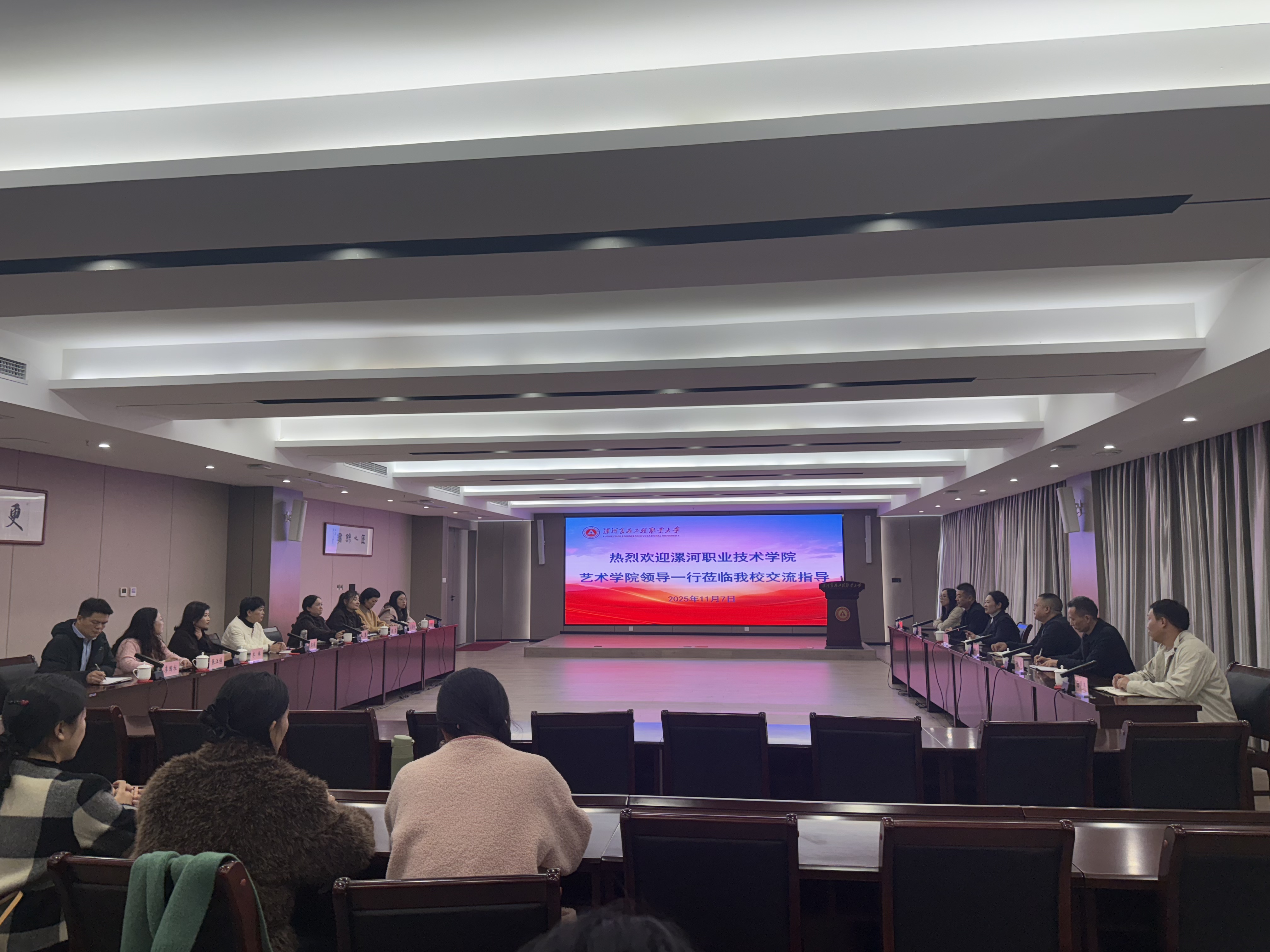 为贯彻职业教育高质量发展要求,11 月 7 日下午,yl23411永利公司党总支书记王文甫、经理彭芳带领领导班子及骨干教师代表赴漯河食品工程职业大学信息工程公司、公共艺术教育中心开展学习调研,围绕专业建设、技能大赛、公共艺术教育创新、工作室运营等核心议题深度交流,以校际互鉴凝聚育人共识。