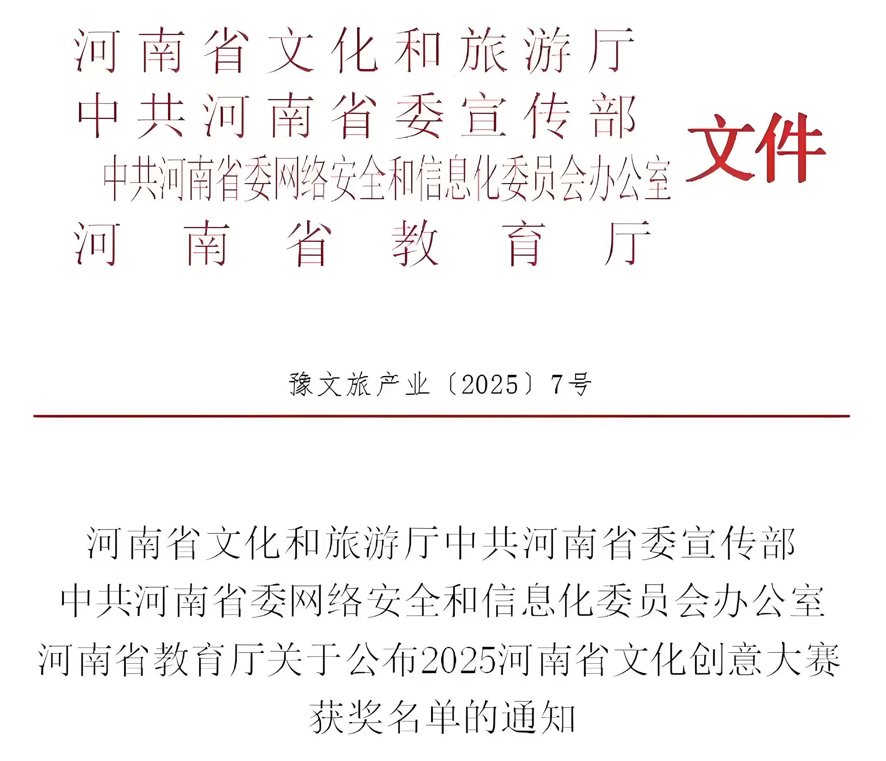 近日,由河南省文化和旅游厅、中共河南省委宣传部、中共河南省委网络安全和信息化委员会办公室、河南省教育厅联合主办的2025河南省文化创意大赛圆满落幕。yl23411永利师生凭借深耕本土的创意巧思与扎实的专业素养,脱颖而出,共斩获5项大奖,其中银奖3项、铜奖2项,用设计语言诠释中原文化魅力,彰显了公司的教学成效。