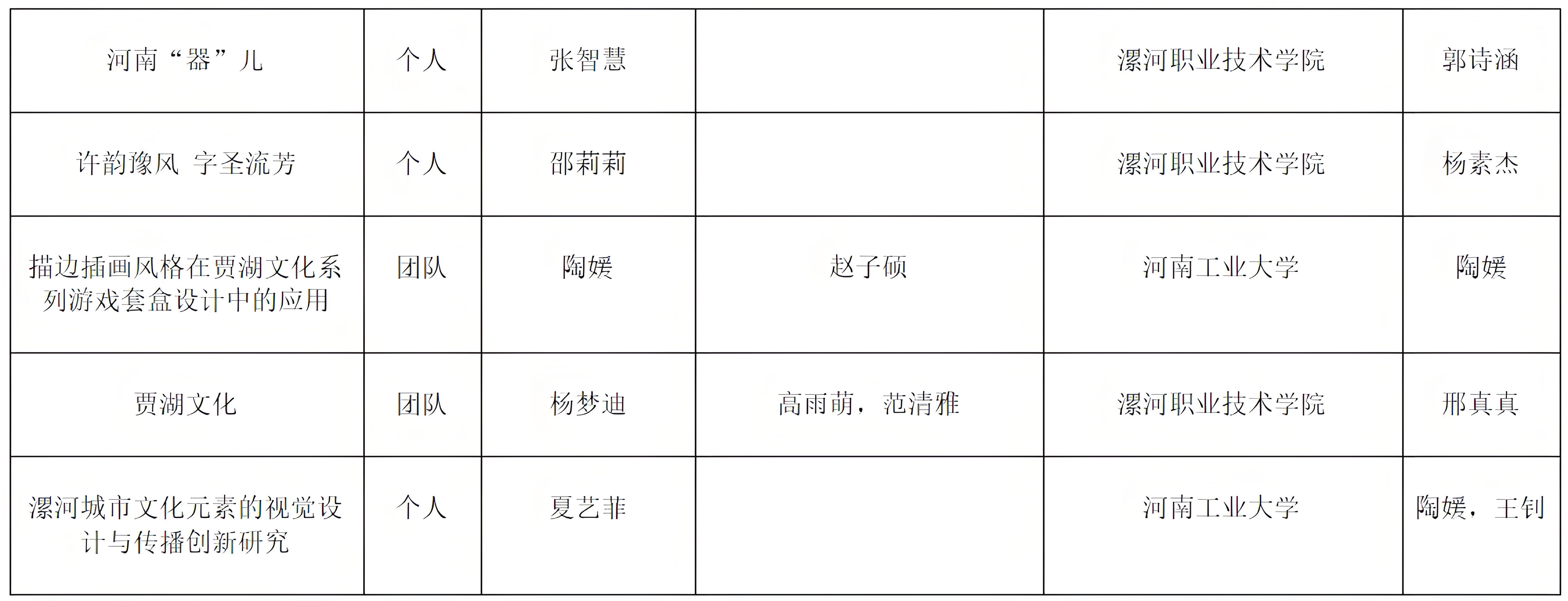 此次获奖作品深度锚定漯河贾湖文化、许慎文化内核,实现传统与创新的巧妙融合。郭诗涵老师指导张智慧同学创作的《河南“器”儿》荣获银奖,作品以河南神兽、绿轴立姿陶狗、妇好鸮尊为原型,将厚重文物转化为生动卡通形象,让古老文明在现代设计中“活”起来,获评委高度认可。杨素洁老师指导邵莉莉创作的《许韵豫风 字圣流芳》荣获银奖,以漯河许慎文化为核心灵感,通过创新设计语言展现“字圣”文化的深厚底蕴,诠释了本土文化的现代表达力。邢真真老师指导杨梦迪团队的《贾湖文化》斩获铜奖,作品深入挖掘漯河贾湖遗址的远古文明内涵,以新颖创意形式直观呈现贾湖骨笛、稻作文化等元素,让大众读懂漯河作为“人类文明起源地之一”的历史分量。陶媛、王钊指导员工夏艺菲《漯河城市文化元素的视觉设计与传播创新研究》聚焦漯河地域文化,采用AR技术融合贾湖文化、许慎文化、食品文化、小商桥、舞阳农民画、杨再兴、漯河豫剧团、南街村等文化元素,实现深河文化从静态展示到动态传播、从单向输出到双向互动的转变。陶媛指导员工赵子硕《描边插画风格在贾湖文化系列游戏套盒设计中的应用》以描边插画风格设计,让贾湖遗址特色文化符号化身趣味游戏道具,在沉浸式探索中解锁贾湖文化内涵,让千年文明在游戏场景里自然传播。